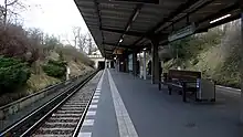 The platform was roofed over in 1978, before only a part of it was under the roof. The U3 trains towards Krumme Lanke emerge above ground after Breitenbachplatz.[1]