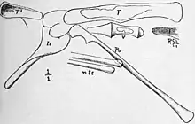 Shufeldt elaborated on his and Heilmann's interpretation of the pubis in 1915, and stated the bone had probably been displaced during fossilization. He pointed out that if it had faced forward, it would have been in forcible contact with the abdominal ribs that would have been dangerous for internal organs during movement.[11] Lull found Heilmann and Shufeldt's criticisms of his pelvis reconstruction probable in 1915. He listed Podokesauridae under the superfamily Compsognatha, and suggested Podokesaurus was perhaps ancestral to the later North American genera Ornitholestes and Ornithimimus.[6] In 1916, Heilmann pointed out that early dinosaurs, parasuchians, and pterosaurs all had similarities to birds, as well as to each other, and that Triassic reptiles like Scleromochlus, Saltopus, and Podokesaurus, were difficult to separate. He proposed that Podokesaurus and other bipedal reptiles from the Triassic were descended from pseudosuchians (which many types of archosaurs were classified as at the time) that may have evolved bipedality by the Permian. He concluded that birds were descended from ornithosuchian pseudosuchians rather than from dinosaurs, due to their bipedality and bird-like legs.[27]