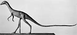 When reading her preliminary description in 1910, Talbot suggested Podokesaurus to have been an "herbivorous dinosaur", but further work at Yale University showed that some bones had been incorrectly identified, and the ischium of the pelvis with a well-developed ridge was found to resemble that of Compsognathus. She refrained from making a definite classification of the specimen in her 1911 description due to the lack of jaw and foot-bones which could have aided in this, but concluded it would have belonged to a "carnivorous dinosaur" based on the shape and position of the pubis, as well as the absence of a postpubis. She considered the fossil to be Triassic in age (the first of the three Mesozoic periods).[8] In 1914, von Huene named the new family Podokesauridae, wherein he, in addition to Podokesaurus, included Saltopus, Procompsognathus, Coelophysis, and Tanystropheus. He placed this group under Coelurosauria, which at the time was used to include small theropods in general.[25][7][26]