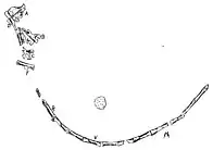 Since few other small theropods were known at the time Podokesaurus was described, it was mainly compared to the later genera Compsognathus, Ornitholestes, and Ornithomimus, which were thought related. Due to the fragmentary nature of the Podokesaurus specimen and the fact that it is lost, the identity and shape of some of its bones are today unclear. As only casts of the specimen now remain, it is only possible to get a general impression of the preserved skeleton and its proportions. Talbot identified bone fragments next to the tail as skull bones because two of them were bilaterally symmetric, and one was broadly convex with a sulcus (or furrow) at the midline, and according to Lull, was possibly placed at the upper wall of the skull, not far from the frontal bones. Lull thought other of these elements may have been part of the nasal bones.[6][17] Von Huene instead interpreted these bones as caudals from the middle of the tail.[7]