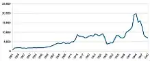 A 4th class stationmasters house and 5th class Class B station were built in 1878. From 1 December 1879 to 31 October 1924 there was a Post Office at the station. By 1884 there was also a platform, cart approach, 40 ft (12 m) by 30 ft (9.1 m) goods shed, loading bank, cattle yards, urinals and a 21 wagon passing loop. In 1914 the goods shed was moved to the other side of the line and in 1939 Marlborough Street level crossing was closed and the station yard was altered. About 1969 $2,600 was spent on half-arm barriers and alarms at the Cameron Street crossing. In 1974 a hand crane was donated to the Museum of Transport & Technology,[1] which also took kauri planks from the closed station at about the same time.[4] After closure in 1980, the goods shed was used as a workshop and storage area for a railway bridge gang, until vandalism and burglary brought about its demolition in 1981.[1] Traffic grew as shown in the graph and table below.