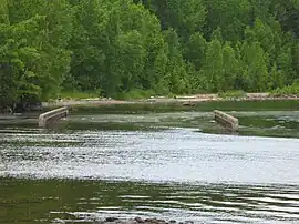 In early spring the reservoir water level is lowered to prevent flooding from spring runoff. During this time you can see part of the Pokiok gorge where the falls once ran.