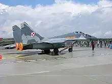The Air Force checkerboard (Polish: szachownica lotnicza) is a national marking for the aircraft of the Polish Air Force, equivalent to roundels used in other nations' air forces. It consists of four equal squares, of which the upper left and lower right are white, and the other two – red. These are surrounded by a border of inverted (counterchanged) colors 1/5 the thickness of a single square. In 1993 the colors were reversed (i.e. white in the upper left).