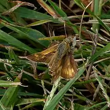 Both sexes have dark brown and yellowish-orange markings as adults. Ventrally, both sexes have a large straw-coloured patch in the middle of the hindwing. This patch helps distinguish it from other Polites.[2] Males are lighter than females, and they have a stigma (round or oval mark) on the forewing.[3] Like other skippers, the ends of the antennae have tiny hooks. The wingspan ranges from 19 to 27 mm.