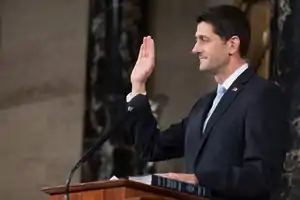 In the 111th Congress, Ryan has sided with a majority of Republicans in 93% of House votes in which he has participated, and has sided with the overall majority vote of all House votes 95% of the time.[6] Ryan chaired the 2016 Republican National Convention. Asked on June 19, 2016, on Meet the Press about his support for Donald Trump, Ryan said "The last thing I want to see happen is another Democrat in the White House." He denied the characterization of his position by interviewer Chuck Todd as "party over country."[7][8][9]