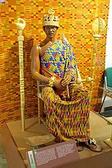 During the period between the death of an Asantehene and the election of a successor, the Mamponghene, the Asantehene's deputy, acted as a regent.[22] This policy was only changed during a time of civil war in the late 19th century, when the Kwasafomanhyiamu or governing council itself ruled as regent.[22] The succession was decided by a series of councils of Asante nobles and other royal family members.[22] The methods of electing a chief varied from one chiefdom to another. For the election of the Asantehene, the Queen mother nominated eligible males as candidates from a royal lineage. She then consulted the elders of that lineage. The final candidate is then selected. The nomination was sent to a council of elders or kingmakers, who represent other Ashanti states.[35] The Nkwankwaahene who represented the commoners, indicated if there was widespread approval or disapproval of the nominee. If the commoners disapproved of the nominee, the process was restarted. If Chosen, the new King was enstooled by the kingmakers.[36][37]