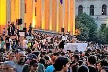 The 2020 parliamentary elections saw the reelection of Georgian Dream for a third term, although the opposition alleged that the elections were rigged and organized protests, boycotting the new Parliament and forcing a new political crisis.[52] That crisis came to an end on 19 April 2021, when opposition parties and Georgian Dream signed a new agreement mediated by European Council President Charles Michel guaranteeing electoral and judicial reforms in exchange for the release of Nika Melia, UNM leader who had been arrested for organizing violence during the 2019 protests.[53] That agreement was short-lived, as the largest opposition party, the United National Movement, refused to sign the agreement, and because of this the ruling Georgian Dream party withdrew its signature within a few months, saying that the agreement failed to reach its goals.[54]