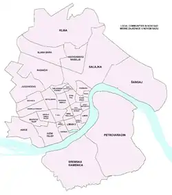 Both municipalities, Petrovaradin and Novi Sad, are divided into local communities (Serbian: Mesne zajednice / Месне заједнице). There are 47 local communities in the city.