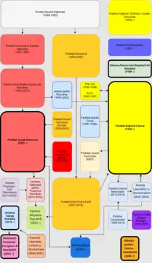 Conservative liberal, centre-right populist, de facto catch all | Nicolae Ciucă | Until November 2021, the largest ruling party through a coalition government previously established in December 2020, but subsequently formed a minority government solely with the UDMR/RMDSZ after early September 2021 until late November of the same year (even after it was dismissed by a recorded-voted no confidence motion). It is currently part of a grand coalition government known as the National Coalition for Romania (CNR for short) along with PSD, being the second largest party within it. Additionally, it has also been crushed by internal disputes, growing corruption scandals, and departures of various MPs and local politicians, some of which had already founded several splinter parties (e.g. most notably Ludovic Orban's Force of the Right or FD for short). | |