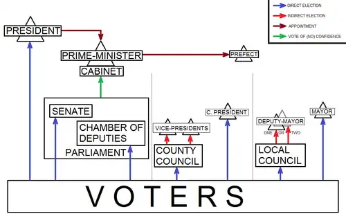The national legislature is a bicameral parliament (Romanian: Parlament), consisting of the Chamber of Deputies (Romanian: Camera Deputaților) and the Senate (Romanian: Senat). Members are elected to four-year terms by universal suffrage in a party-list proportional representation electoral system. Beginning in 2008, members are elected by mixed-member proportional representation.