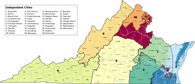 In the 2010 elections, Republicans won three United States House of Representatives seats from the Democrats. Of the state's eleven seats in the House of Representatives, Democrats hold six and Republicans hold five. The state is widely considered blue-leaning, a trend that moves parallel with the growth of the Washington D.C. and Richmond suburbs but has been recognized as a swing state by some in light of the 2021 GOP wave.[34][35][36] A Federal District Court redrew the malapportioned 3rd District as violating the Voting Rights Act for the 2016 election. That allowed Virginians to choose an additional Representative from the 4th District, and added one to the Democratic total.[37] In the 2018 elections, Democrats flipped 3 seats and obtained a 7–4 majority for the first time since 2008. In the 2022 elections, Democrats lost one of those seats in the 2nd district and were reduced to 6–5.