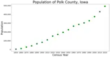 Polk County is located in the U.S. state of Iowa. As of the 2020 census, the population was 492,401.[1] It is Iowa's most populous county, and home to over 15% of the state's residents. The county seat is Des Moines,[2] which is also the capital city of Iowa. Polk County is included in the Des Moines–West Des Moines, IA Metropolitan Statistical Area.[3]