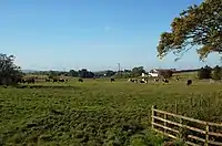 Polkelly Castle, also Pokelly, was an ancient castle located near Fenwick, at NS 4568 4524, in the medieval free Barony of Polkelly, lying north of Kilmarnock, Parish of Fenwick, East Ayrshire, Scotland. The castle is recorded as Powkelly (c1747), Pockelly (c1775), Pow-Kaillie, Ponekell, Polnekel, Pollockelly, Pollockellie, Pokellie, Pothelly, Pathelly Ha'[1] and Polkelly.[2] The name is given circa 1564 as Powkellie when it was held by the Cunninghams of Cunninghamhead.[3]