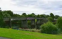 The replacement bridge, being four feet (1.2 metres) narrower than its predecessor, was constructed in 1954–1955, made from prestressed concrete.[3] It was closed by Glasgow City Council on 14 May 2015, for reasons of public safety.[4] Press Reports dated 16 July 2015 indicated the bridge was to be demolished – leaving concrete piers, and allowing restrictions on the stretch of river to be removed. Work to remove the bridge deck, leaving the concrete piers in place, began in October 2015.[5][6] Demolition took about five months, after which access to footpaths along the riverbanks was restored.[7]