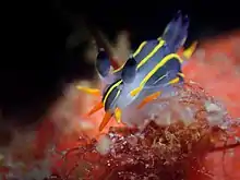 The body of Polycera aurantiomarginata is dark grey or black white with longitudinal yellow lines. The oral veil has six tapering yellow-tipped papillae. There is a broad orange line at the lower edge of the foot.[2]
