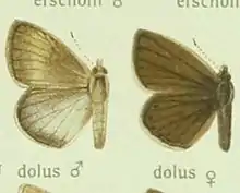 It is escribed in Seitz thus- L. dolus Hbn. (= lefebvrei Godt.) (81 f). male above with a light, silky, grey-blue gloss, nearly as in coridon, but this gloss is restricted to the outer half of the wing, the proximal half being a dirty brown. Female above dark brown with darker veins, resembling almost exactly a male of ripartii on the upperside. Underside rather similar to that of admetus, clearer, with smaller ocelli and without white mesial streak. In South France, and Northern and Central Italy. — ab. vittata Oberth. (81 f) [now P. d. vittata (Oberthür, 1892)] are specimens with a whitish mesial streak on the hindwing beneath; from the Cevennes (Lozere). — menalcas Frr. (= epidolus Frr.) (81 g) is a form from Anterior Asia (or a distinct species?) [now full species Polyommatus menalcas (Freyer, 1837) ] which has a paler underside, smaller ocelli and a very distinct sharply defined mesial streak on the hindwing beneath. In the male the brown colour of the upperside is restricted to the forewing and here concentrated into a dirty brown patch. Turkey and Asia Minor to Turkestan. Larva green when young. later on violet; until June on Onobrychis and Medicago. The butterflies from June till August, locally plentiful, especially flying on fields of Esparcet.[1]