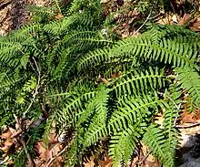 Polypodium virginianum, commonly known as rock polypody, rock cap fern, or common polypody, is a small evergreen species of fern native to the Eastern United States and Canada. It generally grows on rocks and occasionally on tree roots in nature.