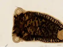 P. integerrimum is a leaf-like flatworm that can grow to a maximum length of about 3 cm (1.2 in). At the anterior (head) end are the mouth and a pair of suckers, and at the posterior end is the main device by which the parasite attaches to its host, the opisthaptor, with its three pairs of suckers, a pair of hooked anchors and marginal hooks.[2] The flatworm's mouth is connected to a muscular pharynx, an oesophagus and a gut, but it has no anus.[1]