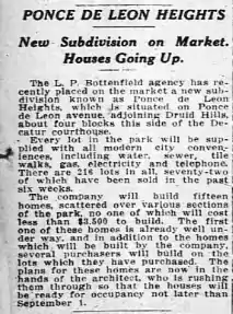 The name of the community is apparently derived from fronting on the north side of Ponce de Leon Avenue, and from the hilly terrain of west Decatur. Ponce de Leon Heights homes were primarily constructed starting in 1914, sit on small lots and include many examples of Craftsman bungalows architectural style. Streets in the community include Clarion Ave., Nelson Ferry Rd., Woodlawn Ave., Fairfield St. and the southeast leg of Coventry Rd.