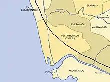 Vettathunad, also known as the Kingdom of Tanur, was a coastal city-state kingdom in the Malabar Coast. It was ruled by the Vettathu Raja, who was dependent on the Zamorin of Calicut. The Kshatriya family of the Vettathu Rajas became extinct with the death of the last Raja on 24 May 1793.[7] Vettathunad consisted of the following 21 Amsoms: