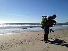 In a pony bottle emergency gas system the back-up regulator is a complete diving regulator (first and second stages, and often a submersible pressure gauge) on a separate cylinder which is not intended for use as primary breathing gas during the dive. It provides a totally redundant emergency air supply. The pony bottle is usually smaller than the primary cylinder, but it should provide enough breathing gas to make a totally controlled return to the surface, including any required decompression stop or safety stop along the way. The pony cylinder capacity will depend on the profile for safe ascent to the surface required for a particular dive plan. Popular sizes for use as a bailout cylinder include 6, 13 or 19 cu ft in the US, while 2 litre and 3 litre are common sizes in Europe. For deep or deep technical diving or wreck diving 30 and 40 cu ft (5 litre and 7 litre) cylinders are often used. The bailout pony bottle is a basic requirement for low risk solo diving if the dive is too deep for a safe free ascent, as there is no source of emergency air from a buddy.[1] In scientific diving operations, pony bottles can be standard equipment in tethered scuba diving operations where the diver is often solo but connected to the surface by communications equipment, and an emergency gas supply is mandated.[2] Several scuba manufacturers produce a minimalist backpack harness that supports a back mounted pony cylinder exclusively for use in shallow water diving or for boat maintenance purposes.[3]