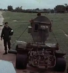 The Pookie was a small one-person vehicle named after the bush baby, and fitted with large Formula One tires bought second hand after the South African Grand Prix. The wide tyres prevented the detonation of buried mines by exerting less ground pressure than a human footprint and spanning the mines' circumference.[1] The vehicle was made with readily available parts from the Volkswagen Kombi and resembled a small go-cart with an elevated cab to protect the driver.[1] The bottom of the cab had a V-shaped reinforced hull to deflect the blast away from the operator. Sensor 'pans', resembling rectangular wings, were lowered and used parallel to the ground below the cab. When the vehicle was transported, the pans were raised at a 45 degree angle.