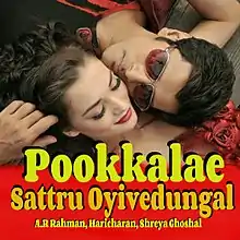 "Pookkalae Sattru Oyivedungal" (Tamil script: பூக்களே சற்று ஓய்வெடுங்கள், transl.Oh flowers... Rest a while) is a romantic Tamil song from the 2015 Tamil film, I. Composed by A. R. Rahman, the song is sung by Shreya Ghoshal and Haricharan, with lyrics penned by Madhan Karky.[1] The music video of the track features actors Vikram and Amy Jackson.[2] The song was re-dubbed in two other languages. The Hindi version of the song "Tu Chale", sung by Arijit Singh and Ghoshal is written by Irshad Kamil while the Telugu version of the song "Poolane Kunukeyamantaa" was sung by Haricharan and Ghoshal and the lyrics for the version is penned by Ananta Sriram. The music video of the song was shot in several locations of China.