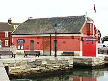 The crew facilities and storeroom occupies one part of a larger brick-built building facing the water on Poole Quay. The upper floor is set into the roof with a large window overlooking the lifeboat's pontoon. The boathouse for the ILB is moored alongside this pontoon and is constructed of corrugated metal.