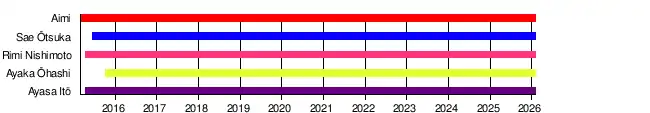The band consists of Aimi (lead vocals, rhythm guitar), Sae Ōtsuka (lead guitar), Rimi Nishimoto (bass), Ayaka Ōhashi (drums), and Ayasa Itō (keyboard). In the anime and game, the band is represented by Kasumi Toyama (Aimi), Tae Hanazono (Ōtsuka), Rimi Ushigome (Nishimoto), Sāya Yamabuki (Ōhashi), and Arisa Ichigaya (Itō). Poppin'Party serves as the protagonists of the anime, which began airing in 2017.