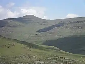 Popple Peak (Afrikaans: Popplepiek) is a mountain in the Drakensberg range, South Africa. It is located on the border between South Africa and Lesotho, on the watershed that forms the border between the two countries. Popple peak is 3331 m[3] above sea level and has an elevation of approximately 300 metres from the surrounding escarpment. It is the 13th highest peak in South Africa[4] and it is visible from as far away as Estcourt and Ladysmith in the KwaZulu-Natal Midlands.