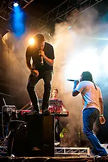 Publicity for blues parties was largely through word of mouth or over pirate radio stations and generally did not include precise details of addresses or locations, so sound systems attracted loyal but highly localised followings.[127] Sounds would also often "play out" in neighbouring areas or challenge other sound systems in a competitive sound clash, allowing the more prominent outfits to attract wider attention – during the 1970s and 1980s the better-known Handsworth sounds would attract visitors from as far afield as London, Manchester and Bristol.[128] Notable Birmingham sound systems whose reputations extended beyond the city included Quaker City, which was founded in 1965;[129] Duke Alloy, which was founded in 1966 and featured the toaster Astro who later became part of UB40;[130] and Wassifa, which featured Macka B, the most influential British toaster of the 1980s.[131] The founders of the reggae band Eclipse, who met at a blues party, later recalled "Blues would took place everywhere. You only had to go out in Lozells or down the Soho Rd, there was loads going on, you could stand and listen to the music coming out of the houses, pubs and clubs."[123]