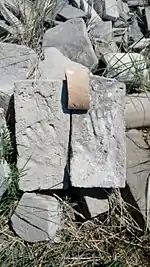 The inner courtyard held the main complex which consisted of a two-part central structure and two flanking galleries. The two buildings of the central structure, one behind the other, stood on square platforms which had been built up of clay layers and faced with bricks which were coated with lime plaster. The larger building was subdivided by wattle-and-daub panels into two halls and a series of smaller rooms. Walls and panels were covered with lime plaster which was painted with geometric designs and horizontal red stripes; the presence of two layers of plaster of different quality suggests repairs. The tiled roof had been supported by 36 wooden columns resting on stone bases. The building appeared to be of post-and-beam construction characteristic of Chinese Tang architecture; this is indicated by burnt timber fragments of interlocking wooden brackets in the Chinese style called dougong.[9] The decorative eave end-tiles recovered from the site are broadly analogous to those found in Tang contexts, however recent studies indicate they form part of a distinctive Uyghur stylistic typology.[10]