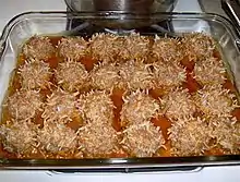 Porcupine meatballs are an American casserole dish of ground beef and rice meatballs cooked in tomato sauce. They were a staple during the Great Depression requiring only a few basic ingredients: ground beef, uncooked long-grain rice, onion, and canned tomato soup.[1] The name comes from the appearance of the meatballs, which appear prickly when the rice pokes out of them as they cook, resembling a porcupine.[2]