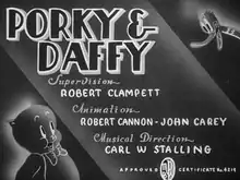 Porky & Daffy is a 1938 Warner Bros. Looney Tunes cartoon directed by Bob Clampett.[2] The cartoon was released on August 6, 1938, and stars Porky Pig and Daffy Duck.[3]