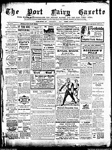 During its publication history, the title of the newspaper alternated between the Port Fairy Gazette and the Gazette.[2] It also absorbed a number of smaller newspapers including the Port Fairy Times & Macarthur news and the Port Fairy News.[1][2]