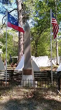 In 1997 a dedication ceremony was held to pay tribute to all soldiers who died at the siege. A group of Civil War reenactors and a modern military honor guard escorted a gun carrier, which bore a wooden coffin containing the sparse remains of victims of both sides. Following the ceremony, the coffin was lowered to its final resting place beneath a single obelisk. The remains were found during an archaeological study began in 1987 to authenticate if graves of soldiers existed at the historic Port Hudson cemetery. Testing in the first season of the study found Confederate and Union buttons confirming the graves were military.[6] An individual buried in a uniform with Union eagle buttons was probably a Union soldier who breached the line and was shot at close range receiving buck shot in the abdominal region.[7]