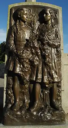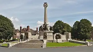 The memorial stands in the most prominent position in the centre of the village, at the intersection of its broadest avenues, The Causeway and The Diamond.[2][3] It is made in granite, with sculptures and reliefs in bronze. At the centre is a runic cross. This stands on an octagonal plinth, on which are the statues of eleven figures. There are inscriptions on the sides of the plinth. Around the plinth is an enclosure with four seating areas, and it is surrounded by a circular parapet. The parapet is broken by four flights of steps. Flanking the tops of the steps are reliefs of groups of children holding wreathes; all the reliefs are different. On each of the four sections of the parapet facing the road is a relief depicting an aspect of the services. Between the flights of steps are flower beds.[4] The monument is about 11.6 metres (38 ft) high, and overall has a diameter of about 22.4 metres (73 ft). The reliefs of children are about 161 centimetres (5.3 ft) high and those depicting the services are about 128 centimetres (4.2 ft) high.[5]