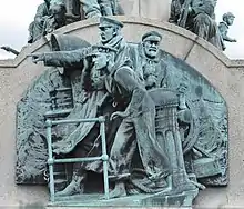The figures on the plinth depict three soldiers, one of whom is wounded and is being attended by a nurse; a seated woman cradling a group of infants; a girl with her brother; and a Boy Scout. These figures are all larger than life size.[4] The reliefs on the parapet depict respectively the Naval, the Military, the Anti-Aircraft and the Red Cross Services.[6]