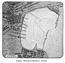 In 1872 Alexander II issued a royal decree, appointing a committee to research and locate proper sites for new sea ports at the Black Sea coast. In 1874 the committee reported that because of the strong bora winds the Tsemes Bay could serve as the main port, thus it was advised to be used for the construction of a cabotage port. Several alternative projects were offered but never implemented.[23] The proximity of Vladikavkaz Railway played a decisive role in site choice, it was planned to connect the bay with the inland transport chains via future Tikhoretsk — Novorossiysk conjunction.[24] The Imperial Ministry of Railways offered several projects of the future port to the State Council. The approved project's construction required 3.5 mln roubles, while the planned cargo turnover was estimated at 30 mln poods.[16][18][23][25]