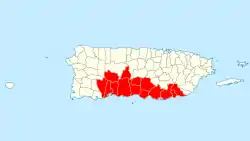 Porta Caribe is a tourism region in southern Puerto Rico. It was established in 2003 by the Puerto Rico Tourism Company, an agency of the Government of Puerto Rico. When created in 2003 it consisted of 14 municipalities in the south central zone (Adjuntas, Arroyo, Coamo, Guayama, Guayanilla, Jayuya, Juana Diaz, Patillas, Peñuelas, Ponce, Salinas, Santa Isabel, Villaba, Yauco).[5][6] With the creation of the neighboring Porta Cordillera zone in July 2012, the municipalities of Adjuntas and Jayuya were transferred to the newly created Porta Cordillera zone and Porta Caribe became a 12-municipality tourism region. The name Porta Caribe translates to "Doorway to the Caribbean."[7] Its executive director is Maritza W. Ruiz Cabán.[8]