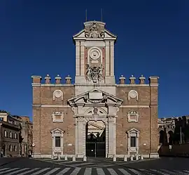 Porta Pia was one of the northern gates in the Aurelian Walls of Rome, Italy. One of Pope Pius IV's civic improvements to the city, it is named after him. Situated at the end of a new street, the Via Pia, it was designed by Michelangelo to replace the Porta Nomentana situated several hundred meters southwards, which was closed up at the same time. Construction began in 1561 and ended in 1565, after the artist's death. A 1561 bronze commemorative medal by Gian Federico Bonzagna shows an early plan by Michelangelo, very different from his final design.[1] The façade on the outside of the city was completed in 1869 under the Neo-Classicist design by Virginio Vespignani.
