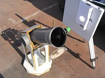 A Dobsonian telescope is an altazimuth-mounted Newtonian telescope design popularized by John Dobson in 1965 and credited with vastly increasing the size of telescopes available to amateur astronomers. Photo of home made dobsonian used to make a solar projection (Split, Croatia).