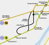 The stations Porte de Saint-Cloud (Line 9) and Porte d'Auteuil (Line 10 westbound) are linked both by the service depots of Auteuil and a single platform situated under the boulevard Murat. A station with a central platform is found here and is called Murat or Porte Molitor.