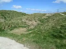 There is a gap in the peninsula, crossed by a modern bridge where there may have been originally a land-bridge; immediately before this there are three massive banks and ditches. Beyond the gap and adjacent to it is a rampart, and a final rampart further west.[2][3]