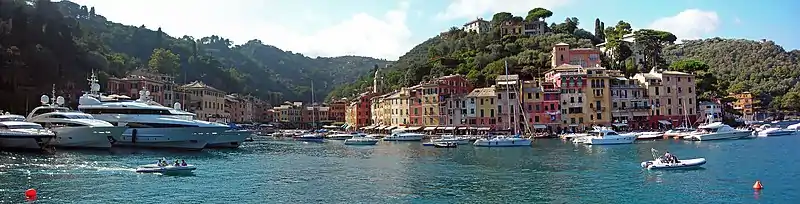 Portofino (Italian pronunciation: [ˌpɔrtoˈfiːno]; Ligurian: Portofin [ˌpɔɾtuˈfiŋ]) is a comune located in the Metropolitan City of Genoa on the Italian Riviera. The town is clustered around its small harbour, and is known for the colourfully painted buildings that line the shore.[3] Since the late 19th century, Portofino has attracted tourism of the European aristocracy and it is now a resort for the world's jet set.[4][5]
