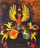 The reverse of Albrecht's panel contains a rendition of the allied Dürer and Holper families' coats of arms,[37] which are shown beneath a winged Moor wearing a red dress.[38] The Dürer family are represented by a crest showing an open door, a pun on the word Dürer (Thürer meaning 'doormaker'). Albrecht the Elder was born in the Hungarian village of Ajtó. Ajtos is Hungarian for "door"—when his parents moved to Germany their name changed from Tür to Düre.[39][upper-alpha 5][20] The Holper crest features a stag, but its significance is lost.[41] The back of Barbara's panel contains imagery of a dragon in a lightning storm set against a rocky landscape or cliff.[7]
