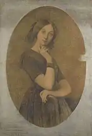 Ever contrary, Ingres later complained that he was unhappy with de Broglie's final portrait, and that he had failed to fully capture her charms.[2] He was relieved when the portrait was met with approval from her family, writing that "family, friends, and above all the loving father [the duc de Broglie] were delighted with it. Finally to crown the work, M. Thiers —and I was not present—came to see it with the subject and repeated to her several times this wicked remark, 'M Ingres must be in love with you to have painted you that way.' But all this does not make me proud, and I do not feel that I have conveyed all the graces of that charming model."[6]