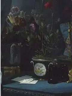 She wears a heavily folded cold grey-blue satin dress, painted with the same hue as her eyes. Her hair is parted and topped with a crimson ribbon at the back. The dresser before the mirror contains a variety of writing materials, pots and flowers, and a lavishly decorated oriental vase. The central motif of both the final painting and its predecessors is her raised left hand index finger, coyly placed by her mouth, and her sinuous, unnaturally elongated right arm.[2]
