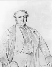 Louis-François Bertin was 66 in 1832, the year of the portrait.[1] He befriended Ingres either through his son Édouard Bertin, a student of the painter,[2] or via Étienne-Jean Delécluze, Ingres' friend and the Journal's art critic.[3] In either case the genesis of the commission is unknown. Bertin was a leader of the French upper class and a supporter of Louis Philippe and the Bourbon Restoration. He was a director of the Le Moniteur Universel until 1823, when the Journal des débats became the recognised voice of the liberal-constitutional opposition after he had come to criticize absolutism. He eventually gave his support to the July Monarchy. The Journal supported contemporary art, and Bertin was a patron, collector and cultivator of writers, painters and other artists.[4] Ingres was sufficiently intrigued by Bertin's personality to accept the commission.[2]