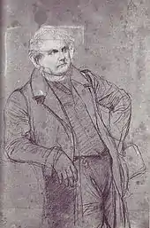 The earliest study has Bertin standing and leaning on a table in an almost Napoleonic pose.[15] His hard, level stare is already established, but the focus seems to be on his groin rather than his face.[16] Ingres struggled with the sketch; the head is on a square of attached paper which must have replaced an earlier cut-out version, and other areas have been rubbed over and heavily reworked. The next extant drawing shows Bertin seated, but the chair is missing. The last extant sketch is the closest to the eventual painting, with a chair, though his bulk has not yet been filled out.[4]